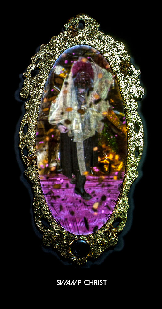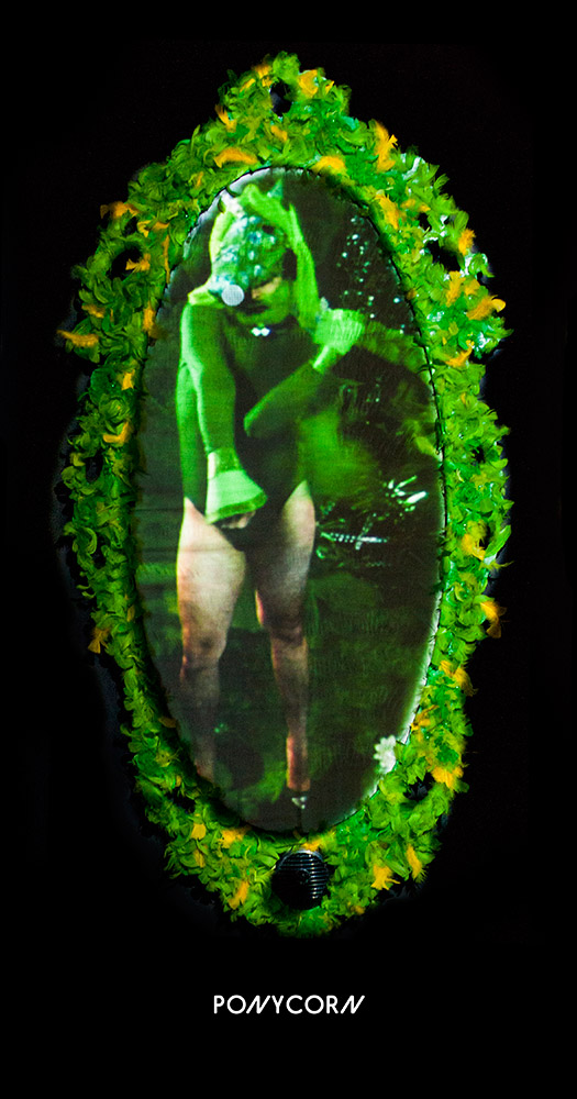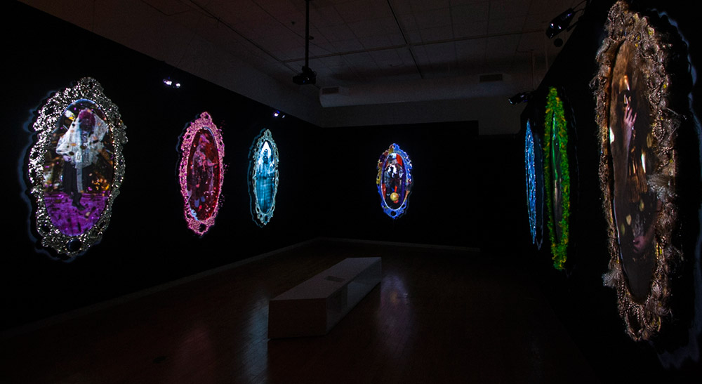 Gilding The Lily is a 7 channel audio video Installation and is a confrontational, ritualistic, and absurd multi-channel audio/video installation that mediates the performance of various personas by further queering an existing queered body. Defined by Urban Dictionary as a euphemism for female masterbation, Gilding the Lily first appeared as a bastardization of the line 'To gild refined gold, to paint the lily', from William Shakespeare's 'King John'. This work is a self portrait that celebrates and critiques excessiveness through fantastical post humanist conceptions of reality. The collection of characters in this work are culled from parallel universes, much like daemons or avatars, whose voices merge and intermingle as entrapped splinters of a singular consciousness. Gilding the Lily is a series of portals into kitschy mythical worlds, reminiscent of Maleficent's mirror in Sleeping Beauty, that explore a range of femininity to masculinity and extend into realms of animal/human hybrids, child-vampire drag queens, divine swamp mutants, and mystical deities. These characters exhibit a desire to be a polymorphous body with endless forms and incarnations through a post singularity extension of humanity and gender expression. These concepts are inspired by Walter Jon Williams's novel 'Aristoi', the work of Genesis P-Orridge, Charles Fréger, Kenneth Anger, Pierre et Gilles, Pyuupiru, James Bidgood, Leigh Bowery, Jack Smith, the Cockettes and countless others. Gilding the Lily is a continuation of interests in the ubiquitous nature of excess in culture, camp's attack on the present via the detritus of the past, the permeability of space-time, forms of masculinity, gender performativity, and a blurring of mismatched sexual fetishes.