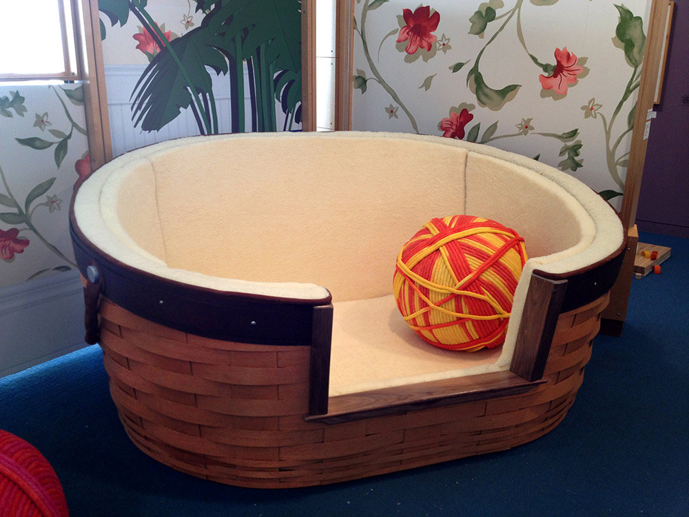 The final component of this artwork was made in collaboration with the Longaberger Company. With the help of their design team, a larger-than-life cat bed/basket was fabricated. This basket was upholstered in a shearling fabric and enhanced by vibration to simulate the purring of a momma cat. This experience was very soothing and comforting and the sensation was described by many visitors as “a hot tub without the water”.