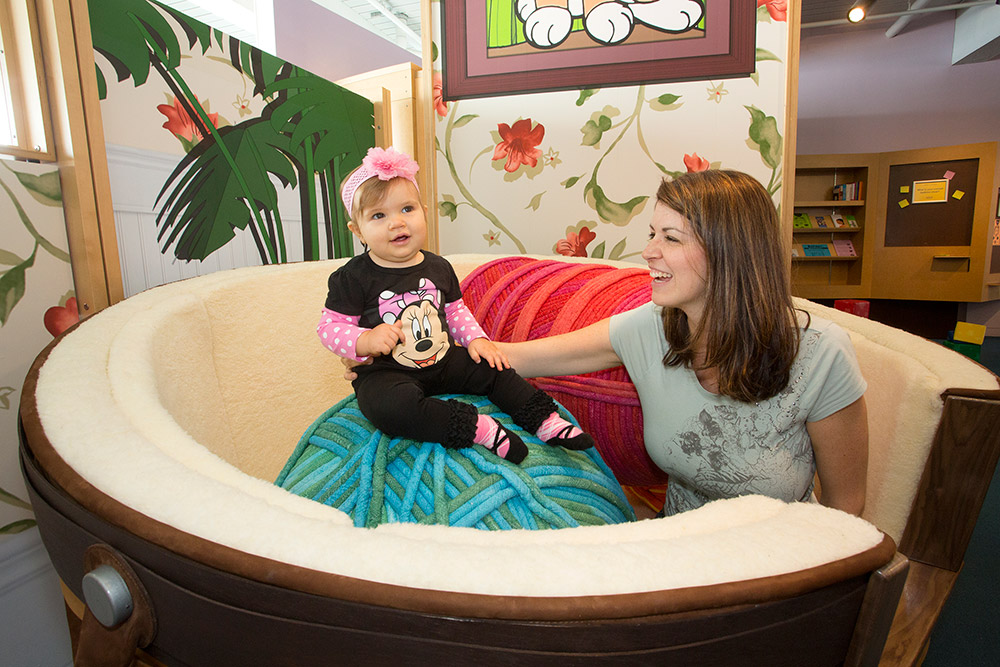 The backdrop of the stage is comprised of a digitally printed wallpaper that exaggerates the scale of a typical living room to reflect a kitten’s viewpoint, similar to cartoons such as Muppet Babies and Roger Rabbit. Children could access the installation via a kitty-sized door so that they entered the stage from the perspective of a kitten.