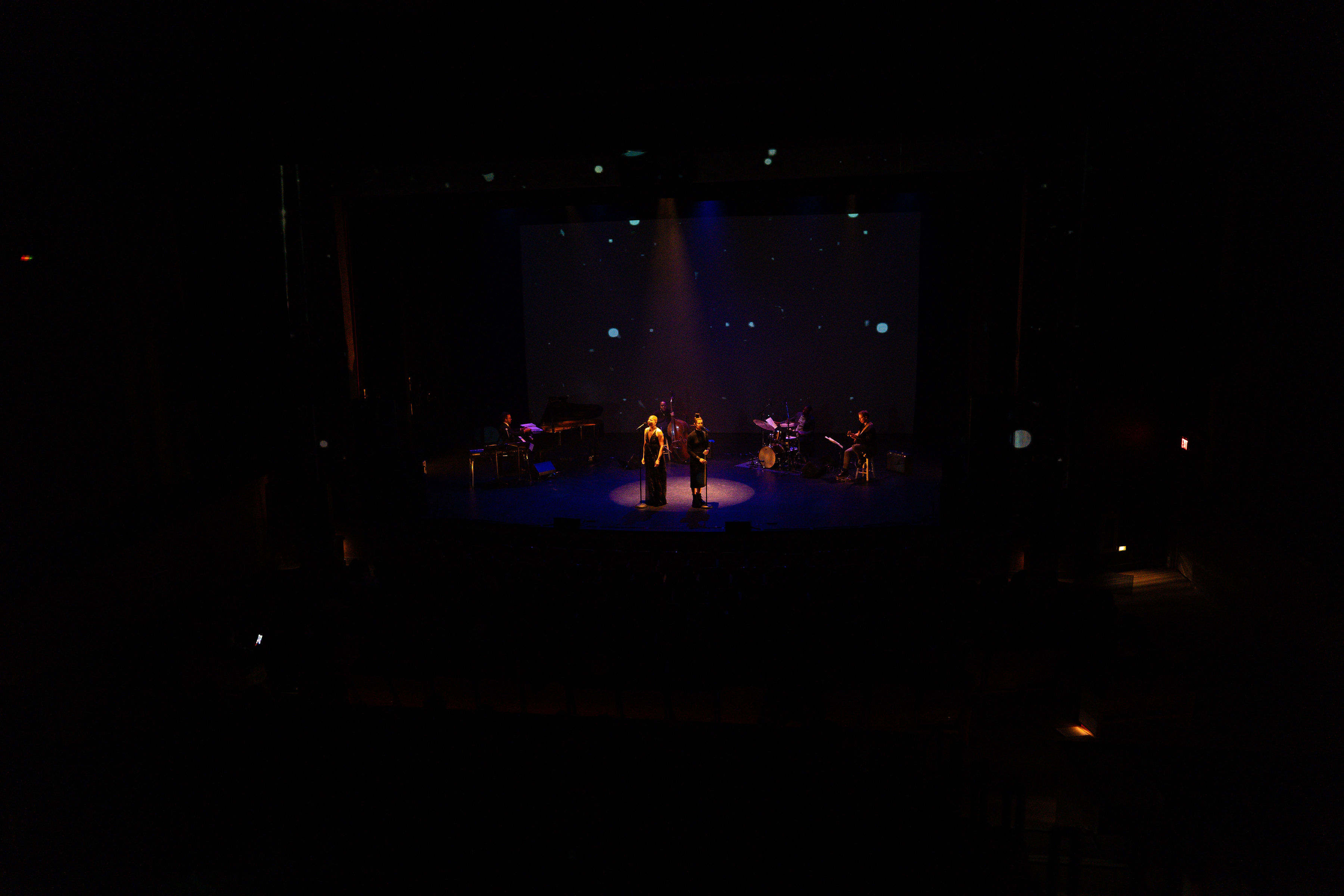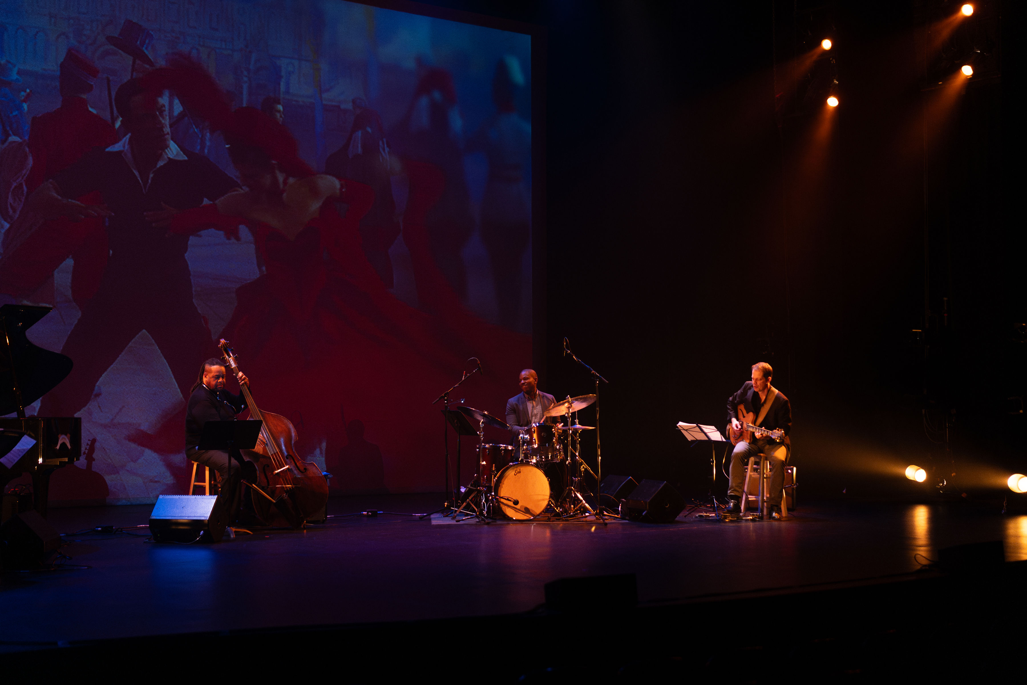 opening%20credits%20copy-5228 Building on John Shannon’s 2021 reinvention of Suite Life, Kelly Strayhorn Theater invited audiences to experience the music of composer Billy Strayhorn and the imagery of performer Gene Kelly in an unforgettable theatrical jazz benefit concert. Under the stage direction of Monteze Freeland (Co-Artistic Director of City Theatre) and musical direction of Akron-based Theron Brown, vocalists Anita Levels (a Pittsburgh favorite) with Kelsey Robinson and Treasure Treasure (Dance & vocals), James Johnson III (Drums), Jordan McBride (Bass), Reggie Watkins (Trombone), and John Shannon (Guitar) himself, the audiences swooned through an unmissable evening, with media design by artist Scott Andrew, and lighting design by Madeleine Steineck.