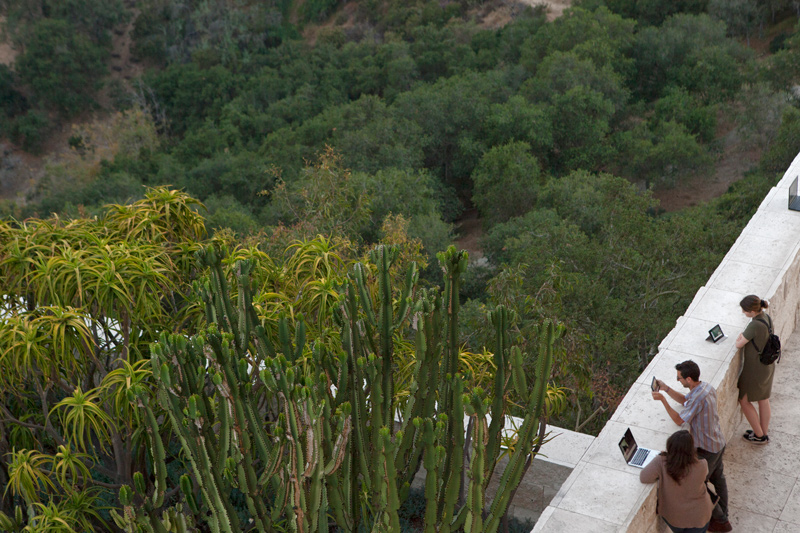 getty1 Other Sky is a project by the Institute for New Feeling, an artist collective including Scott Andrew, Nina Sarnelle, and Agnes Bolt. 50 people wander through the Getty Center at dusk, closely watching the same news network on their phones and laptops. A constructed forecast describes an unprecedented severe weather event predicted to hit Los Angeles that evening. This subtle intervention and expanded video screening weaves a dark, fragmented narrative, while playing with the conventions of screen voyeurism in public space. Only in times of crisis do we see synced content naturally proliferate like this; in tragedy, fear and confusion, we turn to our devices. The performance ends in a communal virtual rain shower meditation.