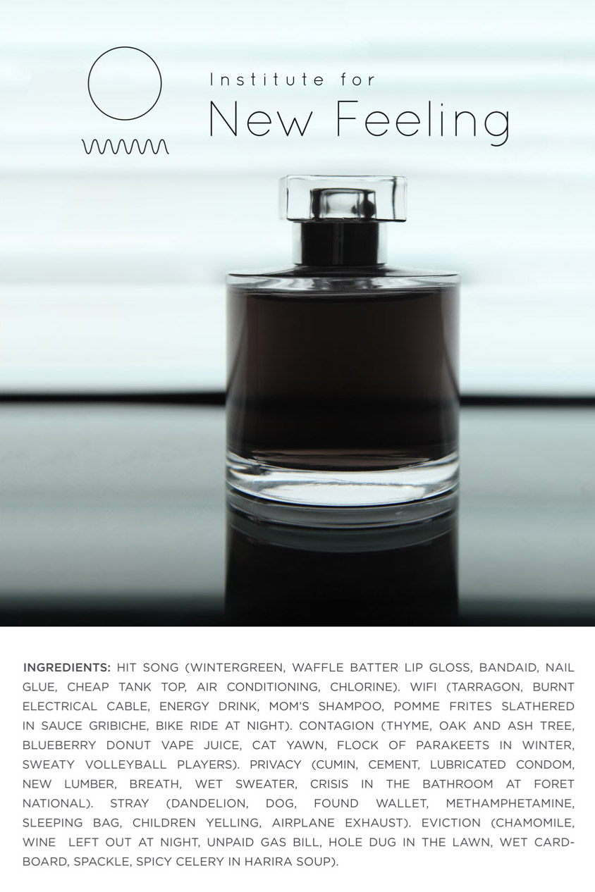 perfume Perfume is a product by the Institute for New Feeling, an artist collective including Scott Andrew, Nina Sarnelle, and Agnes Bolt.