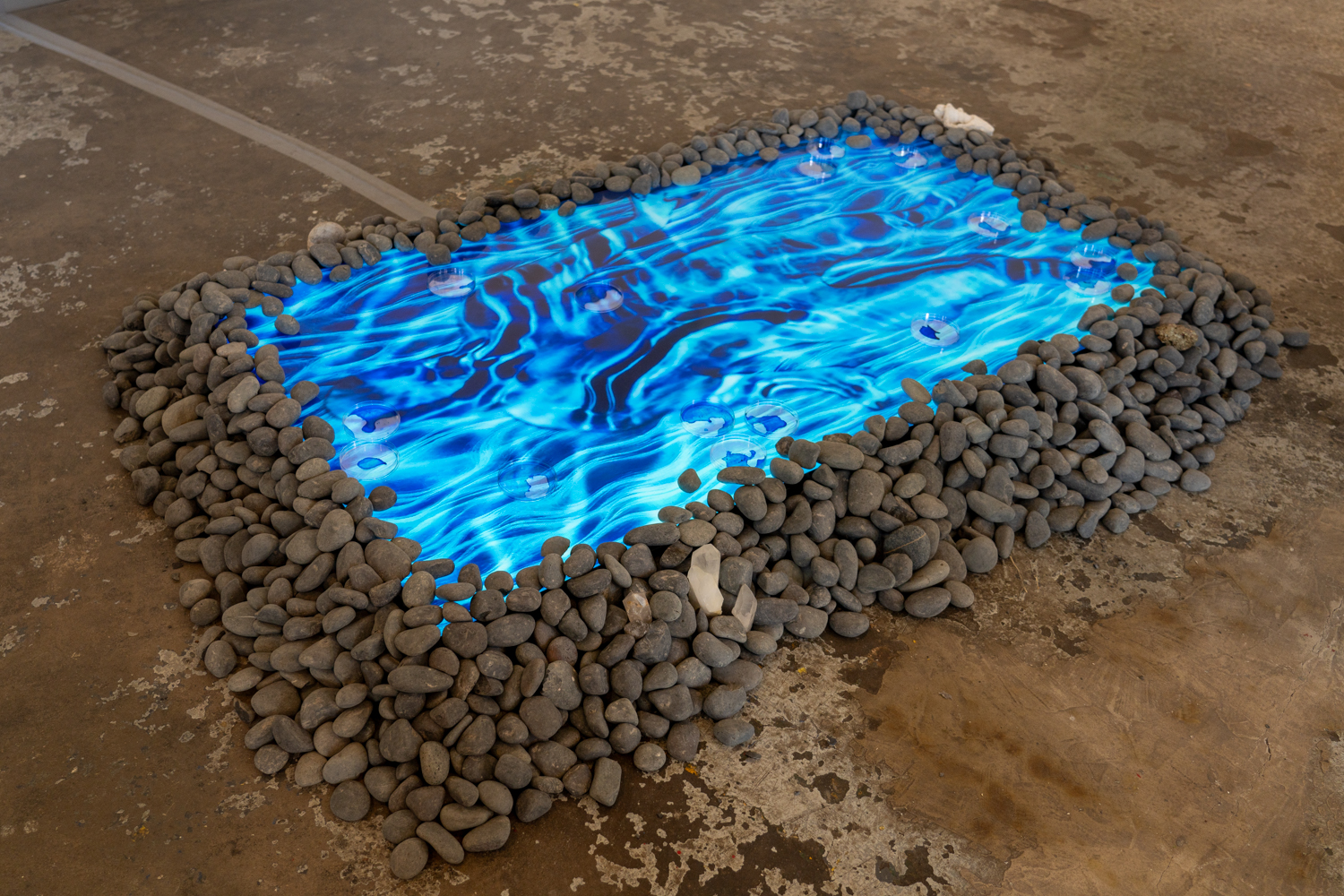 Reflecting Pool is an installation by Scott Andrew that integrates video, AI generative animation, and sound into a sculptural floor work resembling a pool of water that refracts and reflects various personas that are performed by the artist. This work is an extension of previous works like Scott’s MFA thesis at Carnegie Mellon University, entitled, Gilding the Lily, and Phase-Shift which was presented at the Pittsburgh Center for the Arts, and various other video and sculptural sketches. The work takes on the form of a lens, peering beyond the void and into other queer and opulent speculative worlds. This work merges concepts and interests in media like Black Mirror, Everything Everywhere All at Once, and mythical narratives like the mythology of Narcissus as explored through James Bidgood’s Pink Narcissus, as well as countless depictions in art history. The work is discursive of investigations into alternative forms of masculinity, and gender queer fantasy, as well as the permeability of space-time, and post-humanism. It is a work that lives as a form of metaphysical archaeology that digs into other realities.
