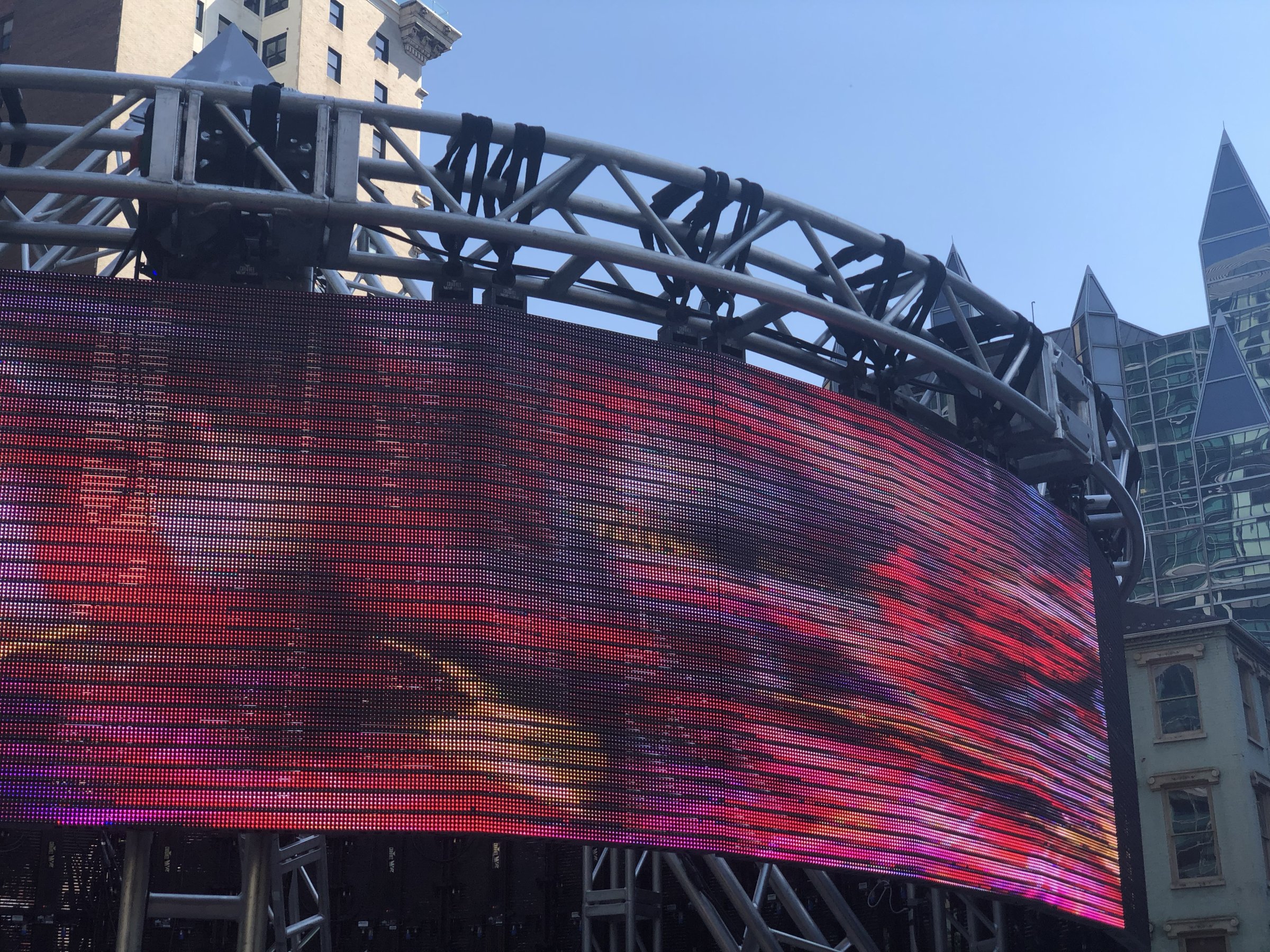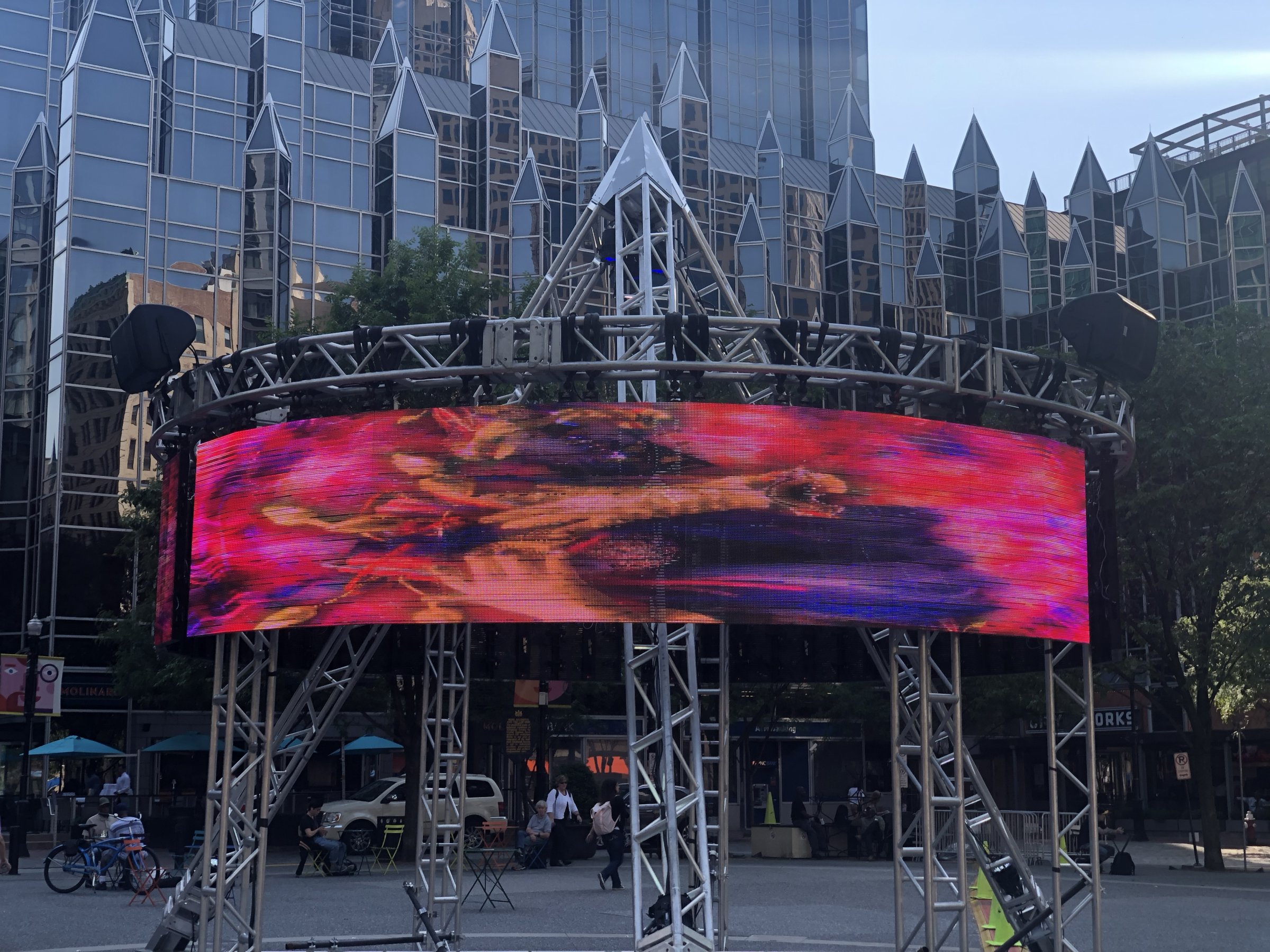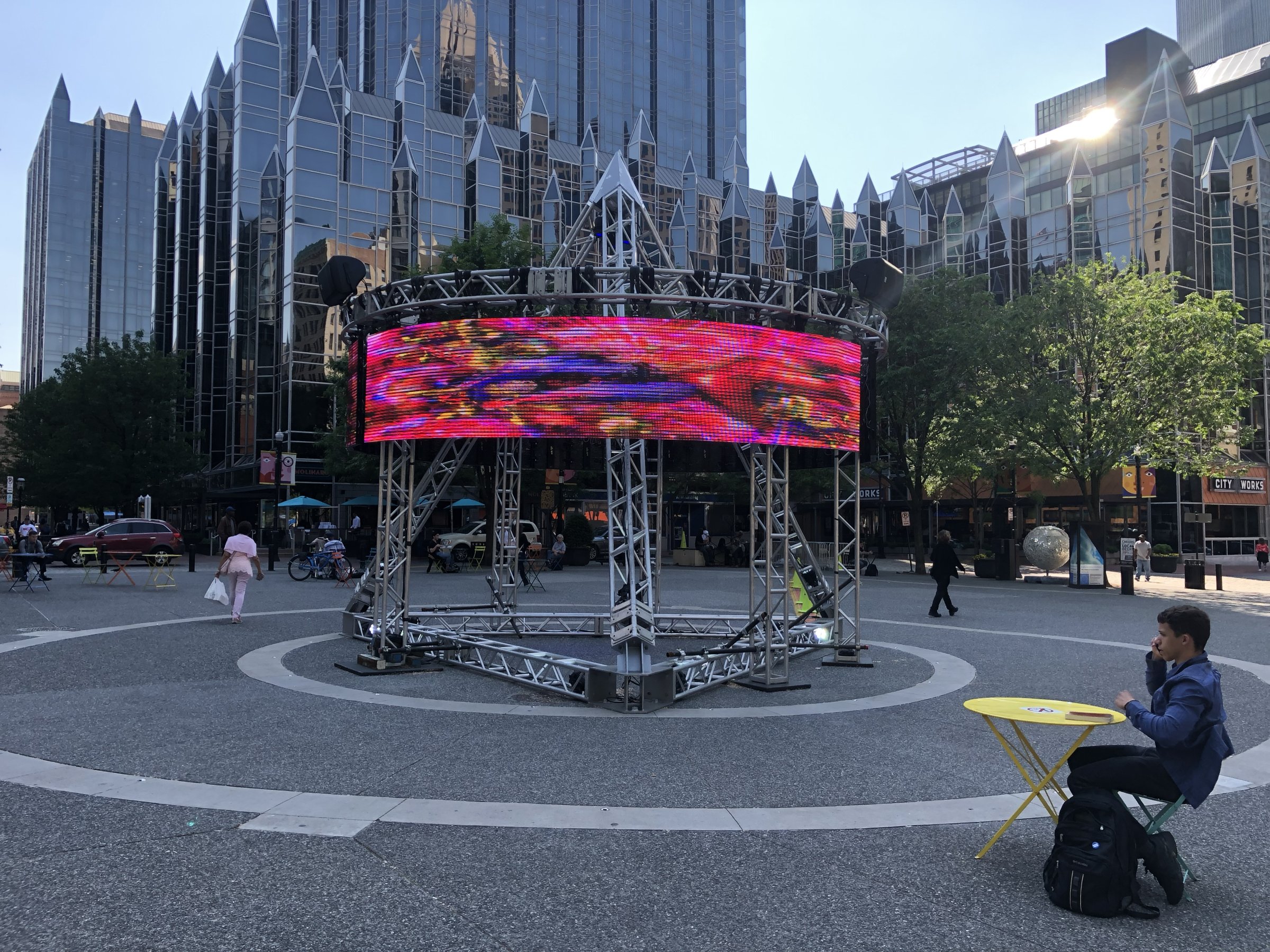Scott Andrew was one of many featured video artists to have work displayed in Streaming Space, a collaborative work by artists Alisha B Wormsley and Ricardo Iamuuri Robinson, transforms Market Square into a space for video, performance, and sound that encourages healing and reflection. The 24-foot-tall truss pyramid holds mounted LED screens that display meditative video montages of nature and space, and show vintage jazz concerts and films, as well as highlight the work of local futurist artists. An accompanying soundtrack, created by the artists, emits from speakers inside of the pyramid.